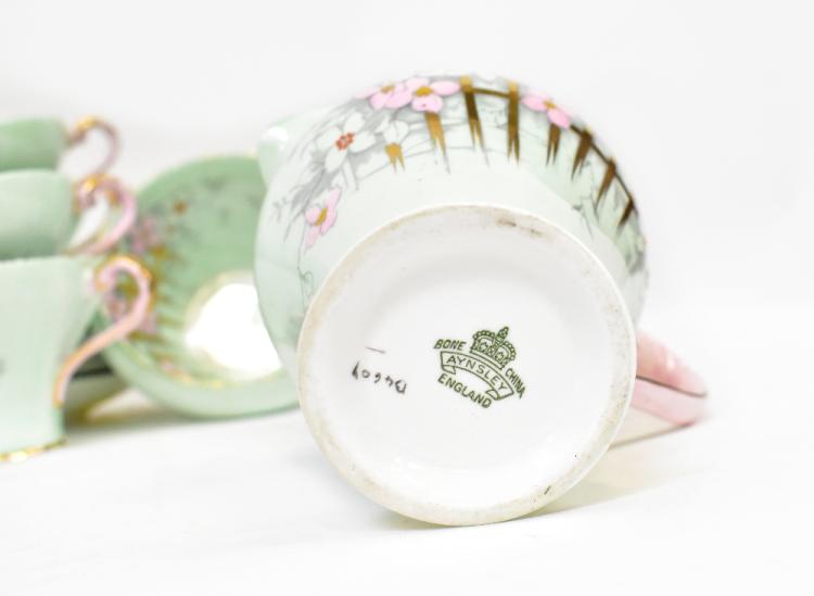Lot 216 of 1493: AYNSLEY; a fourteen-piece Art Deco part coffee set in the B4607 pattern, with hand painted garden flowers and gilt trellis, on an eggshell green body, with pink and gilt handles, height of milk jug 9cm, diameter of sugar bowl 10.5cm.