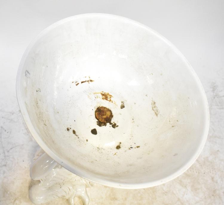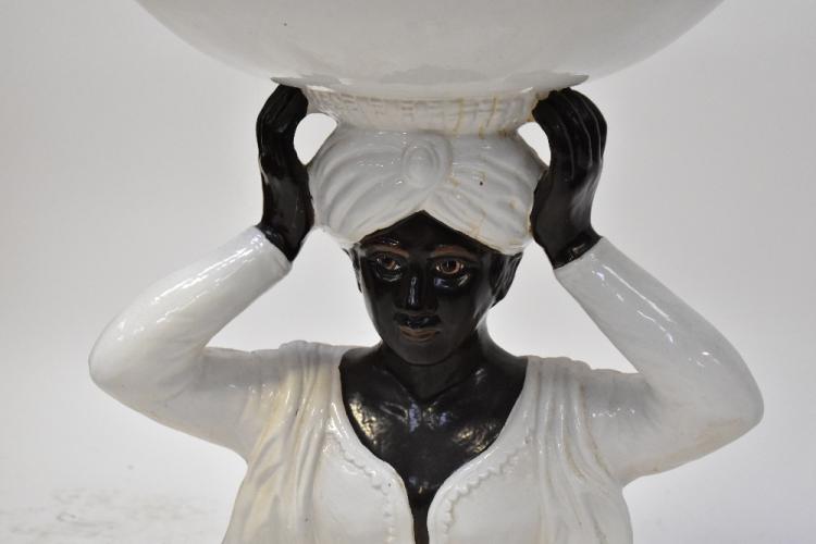 Lot 232 of 1493: A 20th century ceramic decorative Blackamoor plant stand, with large circular white glazed bowl on the head of a seated gentleman wearing a turban and traditional robes, height 74cm.
