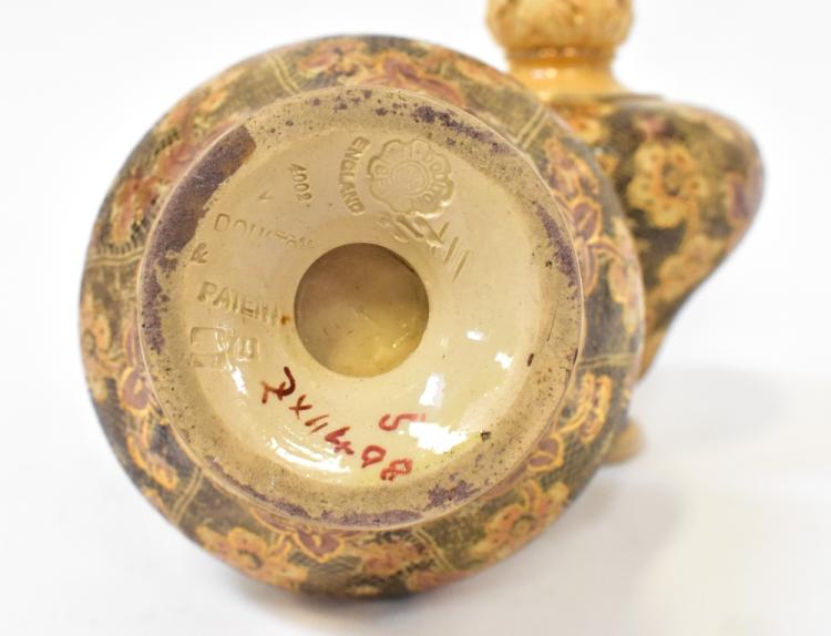 Lot 256 of 1493: DOULTON LAMBETH; a pair of late 19th century stoneware vases of onion shape, with flared rim, on slender tapered necks and bulbous bodies decorated with floral patterns infilled with lace texture, tapering down to small foot rim, brown and cream glazes, impressed Doulton Lambeth mark to the base, date number for 1894-96, decorator's mark 'og' (sic), height 27cm (2).