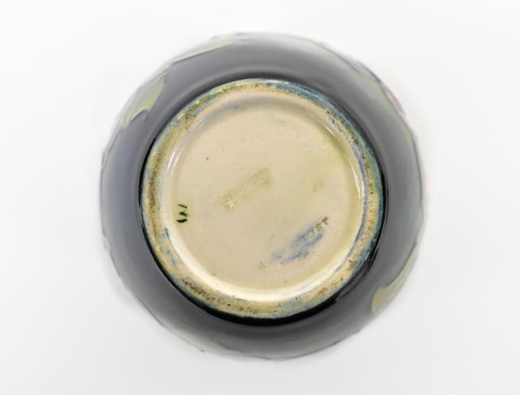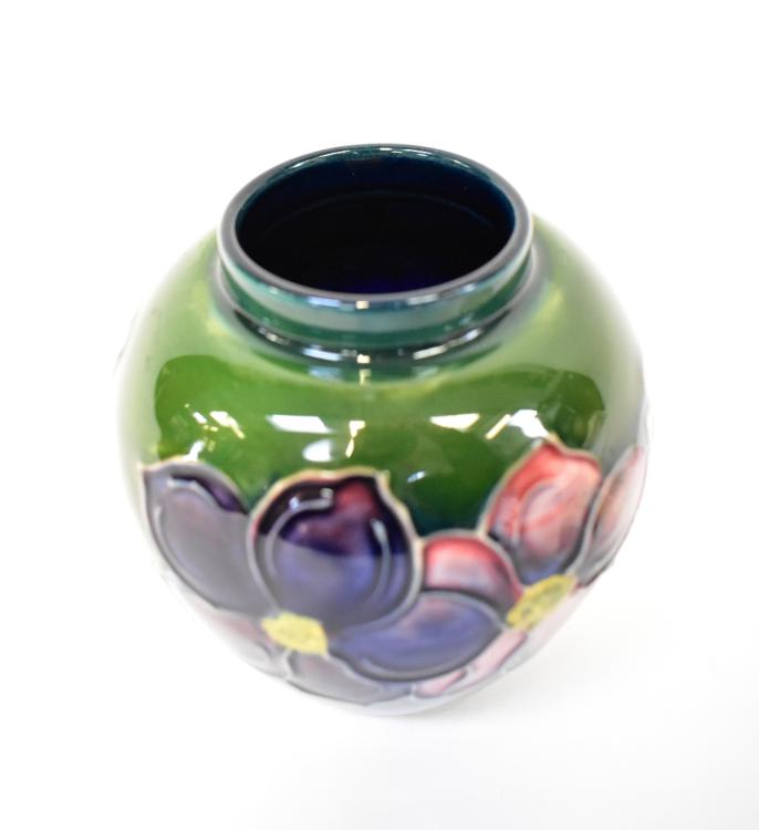 Lot 259 of 1493: MOORCROFT; a small ginger jar with tube lined pansy design, on a green ground, height 11cm.