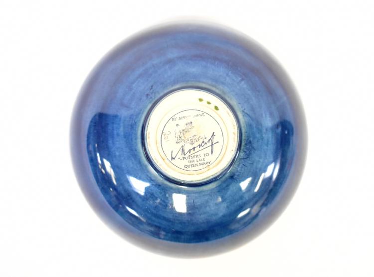 Lot 260 of 1493: WALTER MOORCROFT; a small pedestal dish with centred tube lined pansy, on blue ground, to small foot rim, marked with factory sticker, height 4.5cm, diameter 11.5cm.