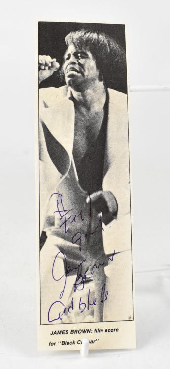 Lot 636 of 1493: JAMES BROWN; a thin photograph taken from a newspaper bearing the star's signature. We have not authenticated this signature, please satisfy yourself as to the veracity of the item prior to bidding.