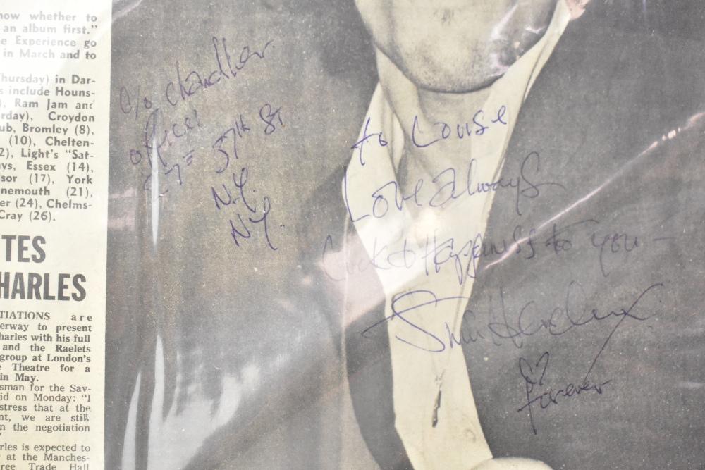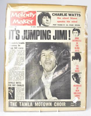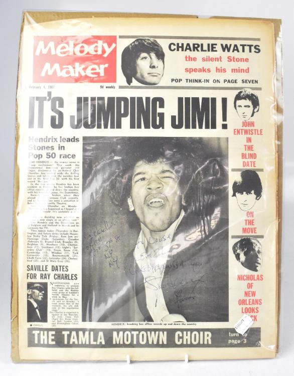 Lot 640 of 1493: JIMI HENDRIX; a copy of 'Melody Maker' 4th February 1967, inscribed 'To Louise love always luck & happiness to you' and bearing the rock legend's signature, 44 x 33.5cm. We have not authenticated this signature, please satisfy yourself as to the veracity of the item prior to bidding.