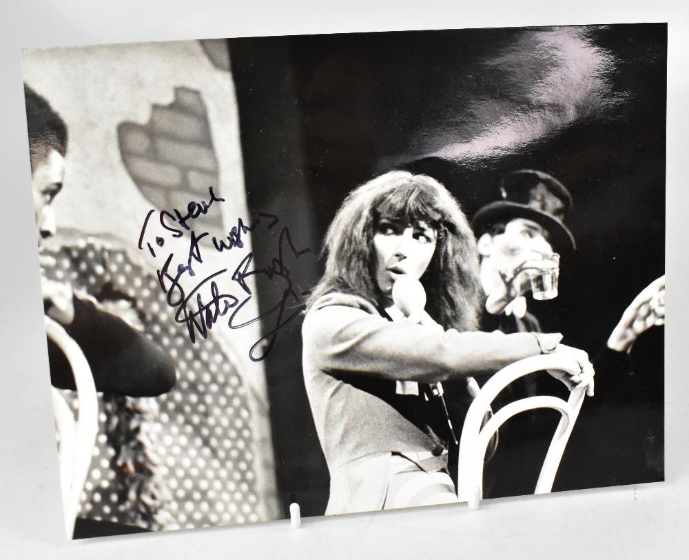 Lot 644 of 1493: KATE BUSH; a black and white photograph bearing the star's signature and inscribed 'To Steve best wishes', 19 x 25cm. We have not authenticated this signature, please satisfy yourself as to the veracity of the item prior to bidding.