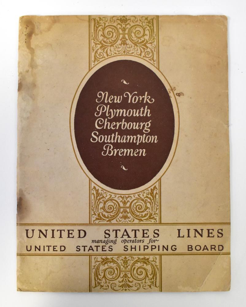 Lot 1021 of 1493: UNITED STATES LINES; Managing Operators for the United States Shipping Board, a commemorative brochure for the steamships 'George Washington', 'President Roosevelt', 'President Harding' and 'The American Republic', states mono depictions of the interior of the ship and ends with Ships and Routes list and also Officers and Agents list.