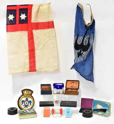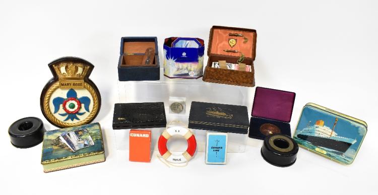 Lot 1103 of 1493: A quantity of maritime collectibles to include two signal flags, a Stratton compact, the lid with painted picture of MV Accra, a boxed medallion commemorating 100 years of the Peninsula and Oriental Steam Navigation Company, a reproduction boss of the Mary Rose, various playing cards from cruise ships, tins, cigarette trays, brushes, pamphlets, promotional cards, etc.