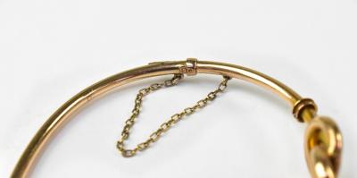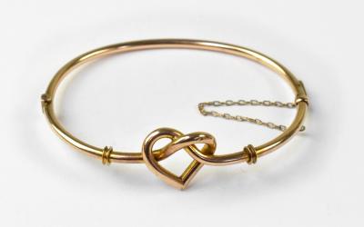 Lot 1327 of 1493: A vintage 9ct gold knotted heart tubular hinged bracelet, with small 9ct gold safety chain, internal diameter from hinge to clasp approx 60mm, approx 4.8g.