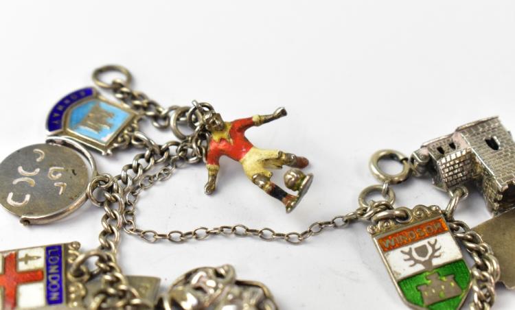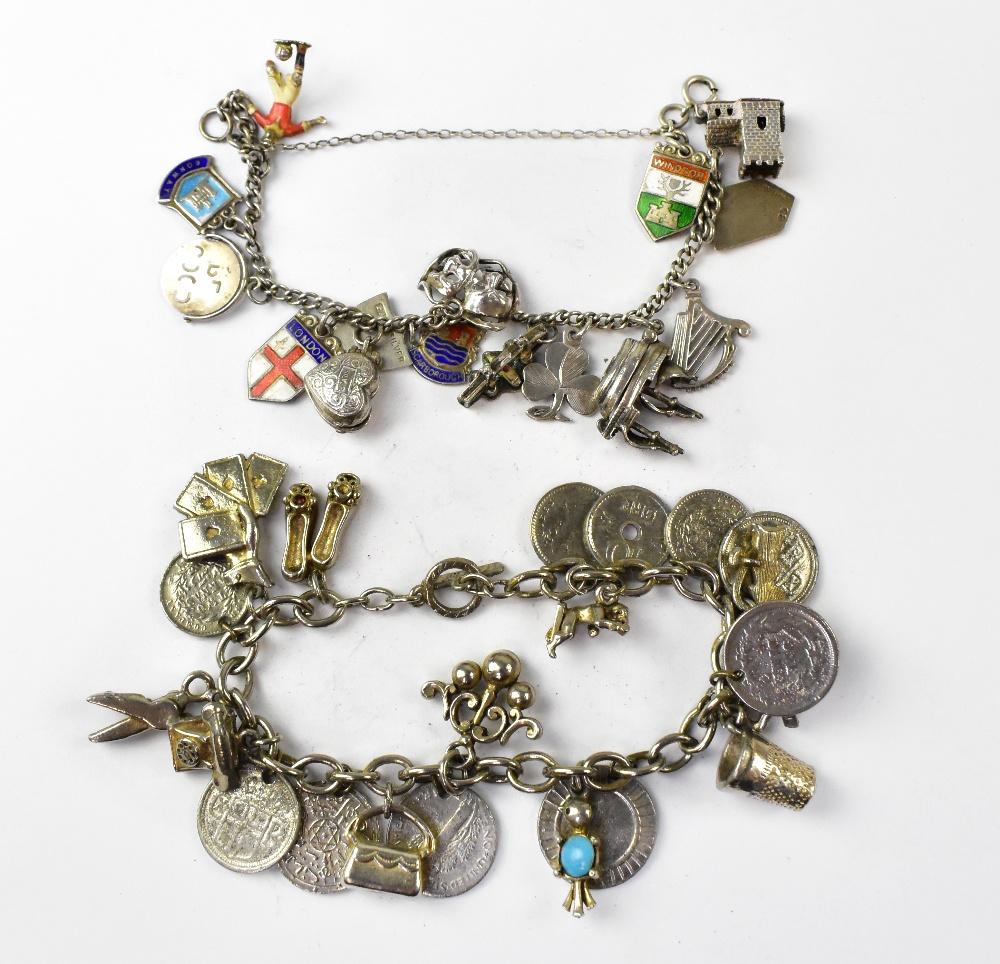 Lot 1333 of 1493: A silver charm bracelet with various charms to include shields, church, galleon, Irish harp, shamrock, loveheart locket, London Bridge, etc and a mixed silver and silver plated charm bracelet, with various charms to include beaker, coins, pawnbroker sign, telephone, hand of cards, etc (2).