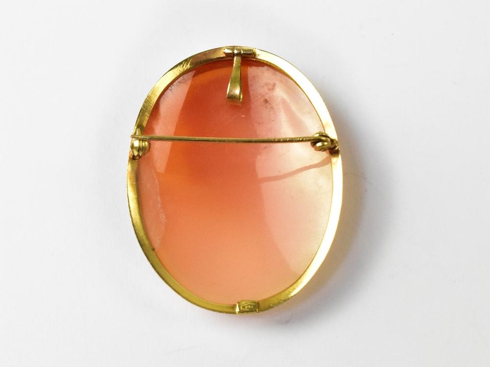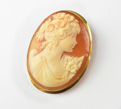 Lot 1341 of 1493: A 20th century carved shell cameo brooch depicting the head and shoulders of a beautiful lady, with flowers in her hair, in an 18ct gold mount, pin and necklace hoop, width approx 3.2cm, height approx 4.3cm.