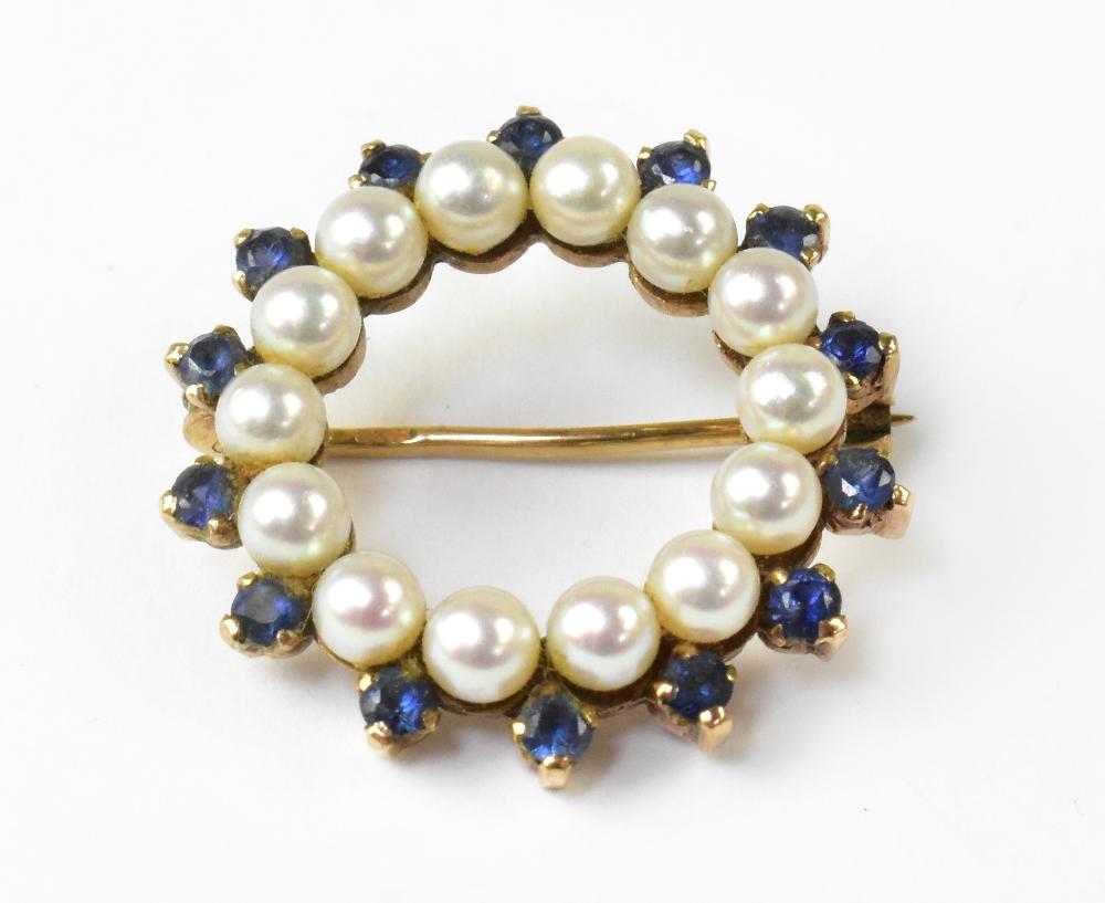 Lot 1342 of 1493: An Edwardian-style circular star brooch, with inner circle of fourteen small cultured pearls surrounded by fourteen small claw set sapphires, in a 9ct gold frame, clasp and pin, width approx 2.6cm, approx 4.5g.
