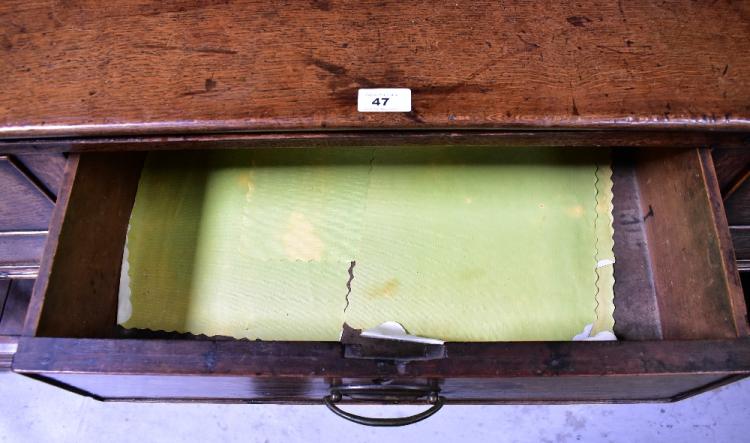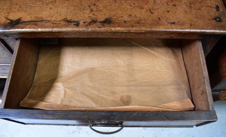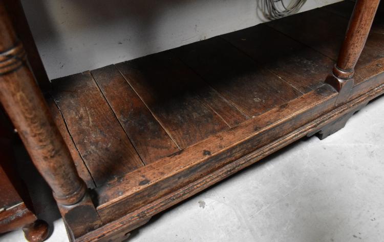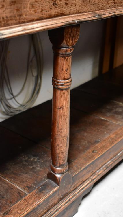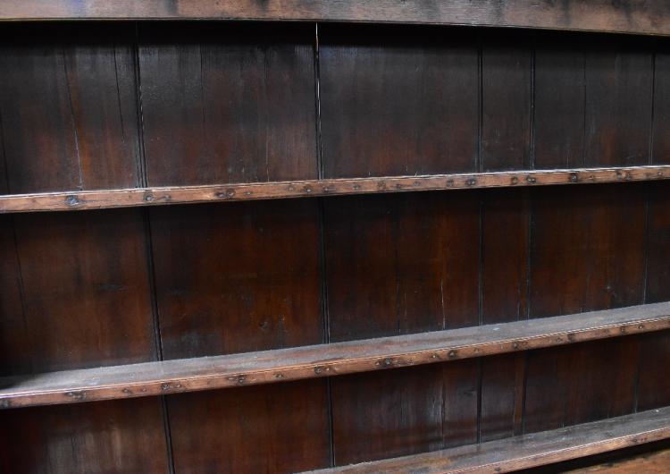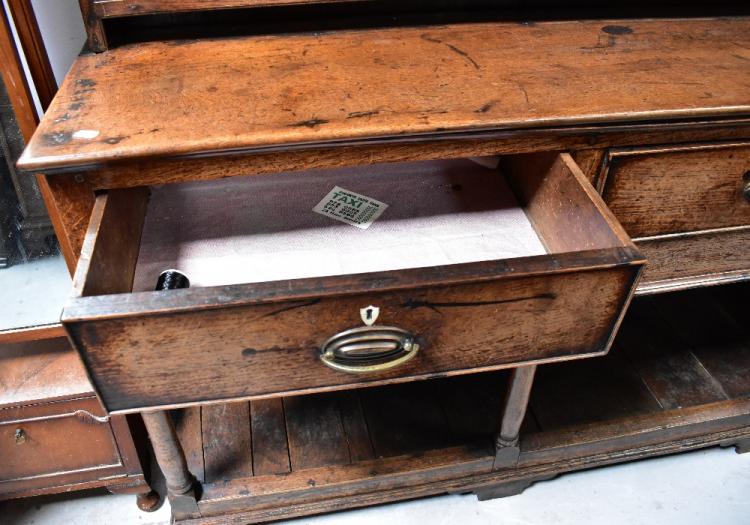 Lot 47 of 873: A George III oak dresser, the moulded cornice above boarded plate rack with three shelves, above a central frieze of three short drawers, raised on turned and block supports to pot board undertier and bracket feet, 194 x 189 x 43cm (af).