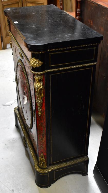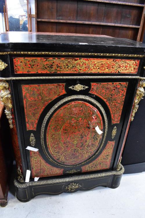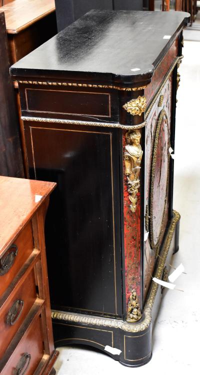 Lot 60 of 873: A 19th century ebonised gilt brass mounted boulle work side cabinet, with single door centred with an oval boulle work panel, within a gilt brass border, above a brass inlaid shaped plinth centred with a further gilt brass floral arrangement, 111 x 87 x 42cm (af).
