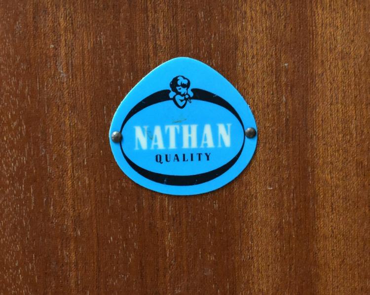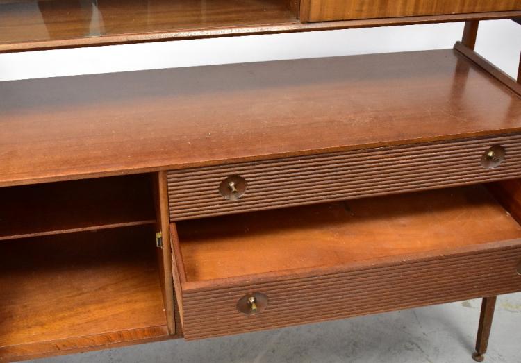 Lot 4 of 1054: NATHAN; a mid-20th century 'Highboard' sideboard, with upper glazed sliding door section, with drop-down cupboard door above a base of three long drawers with linear fronts and a plain cupboard door with label to interior, all with tapered metal handles, on square legs, 126 x 137 x 45cm.