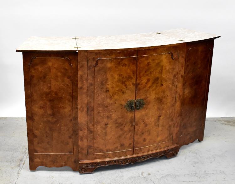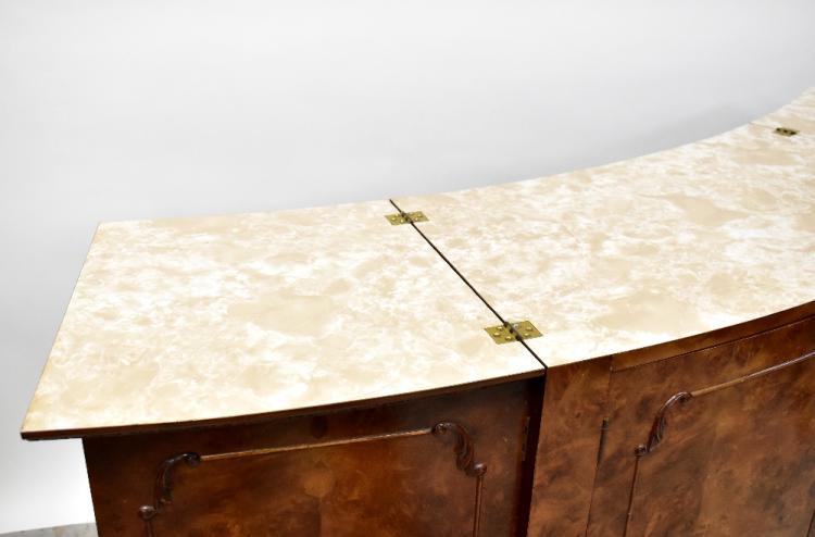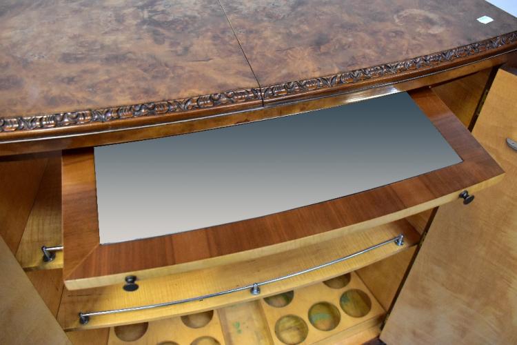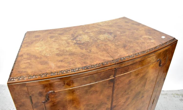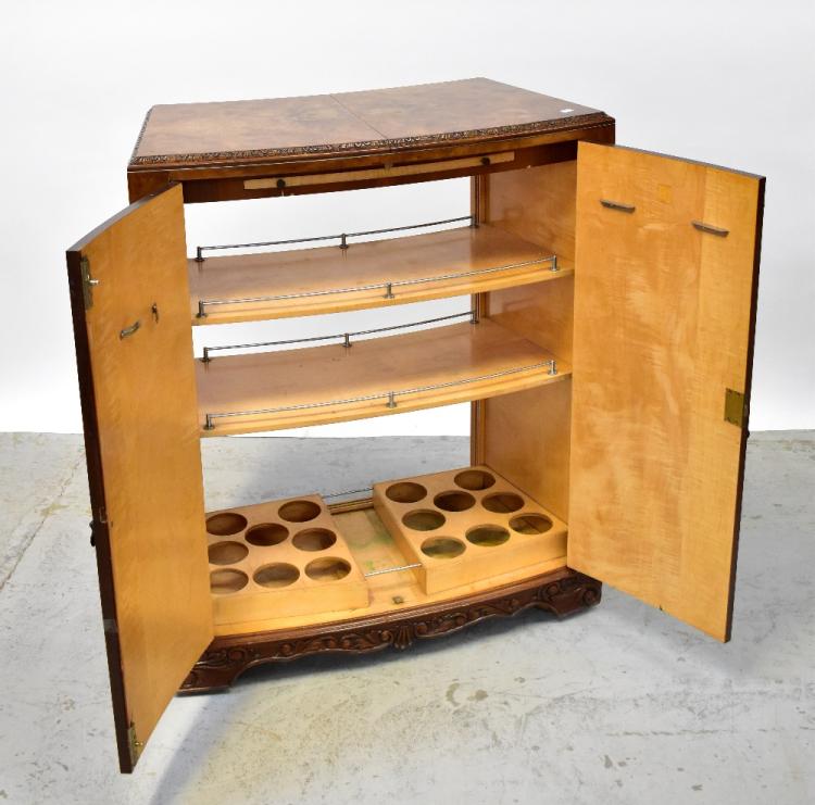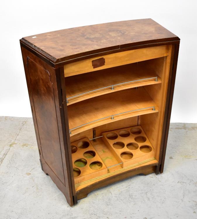 Lot 11 of 1054: GEORGE STRACHAN & SON LTD; a mid-20th century burr walnut veneered bow-fronted drinks cabinet/bar, the two-section fold-over top enclosing a Formica veneered marble-effect bar above a pair of bow-fronted panelled doors with Oriental-style pierced escutcheons, enclosing a satinwood fitted interior, raised on bracket feet, 108 x 91 x 43cm (af).