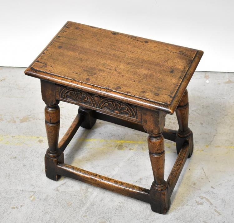 Lot 17 of 1054: An oak joint stool with carved foliate panels to the apron, on turned tapering legs united by stretchers, 47 x 45 x 28cm.