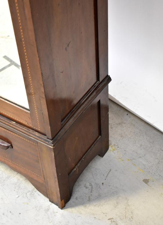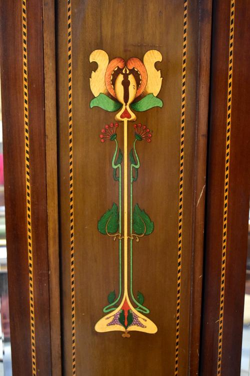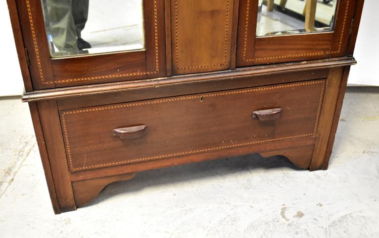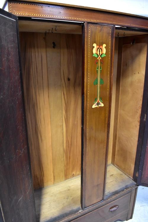 Lot 27 of 1054: An Edwardian Art Nouveau mahogany twin mirror door wardrobe, central panel with Art Nouveau floral design, string inlay throughout, over single drawer to a shaped plinth base, 189 x 105 x 41cm.