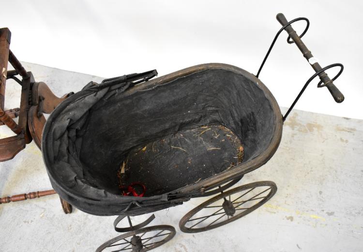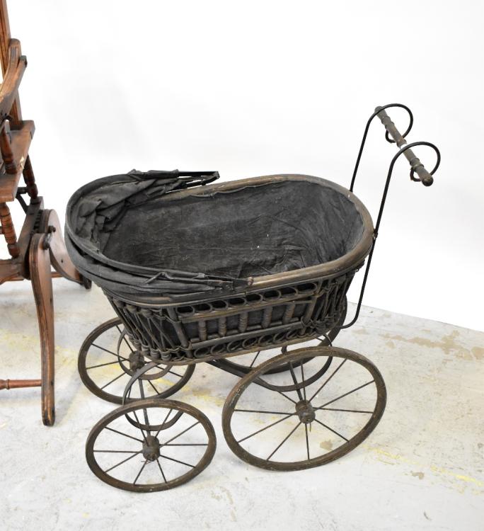 Lot 30 of 1054: An early 20th century metamorphic high chair, converts into a small rocking chair, and a small Victorian black metal and wicker dolls' pram with metal wheels and scrolling handle (2).