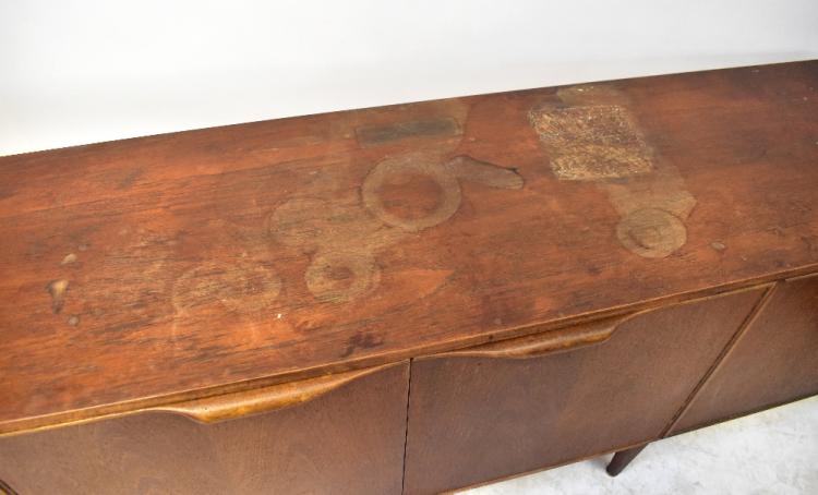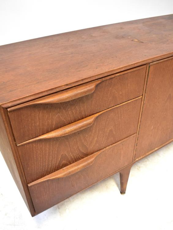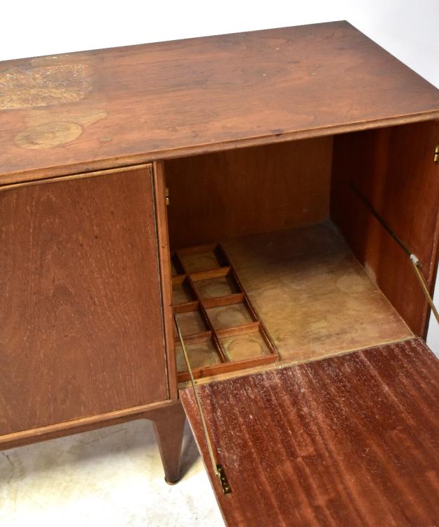 Lot 45 of 1054: MACKINTOSH; a teak sideboard comprising three graduated drawers, a pair of cupboard doors and a single drop-down door with compartments for bottles, on turned tapering legs, 76 x 204 x 48cm.
