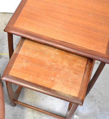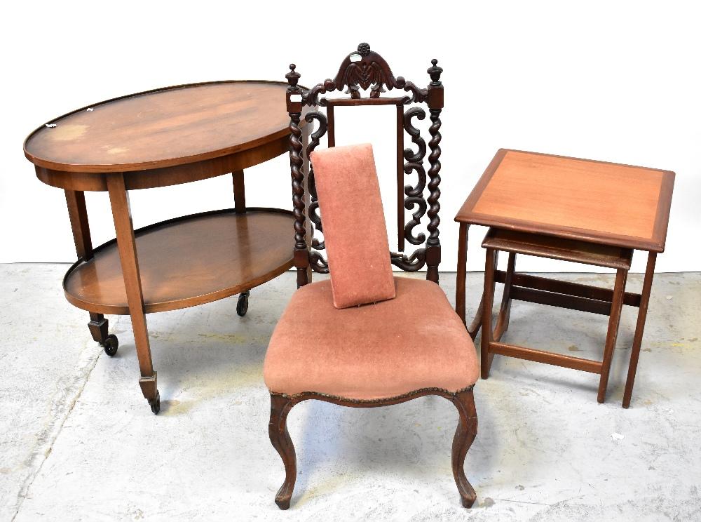 Lot 51 of 1054: A G-Plan partial nest of two tables with stylised bases, together with a 20th century two-tier oval tea trolley and a Victorian mahogany nursing chair with upholstered back panel and serpentine seat, with barleytwist columns and pierced C-scroll motifs (af) (3).