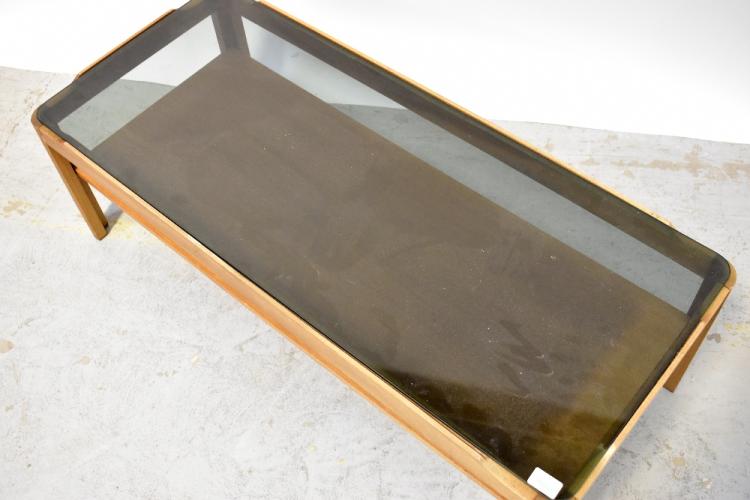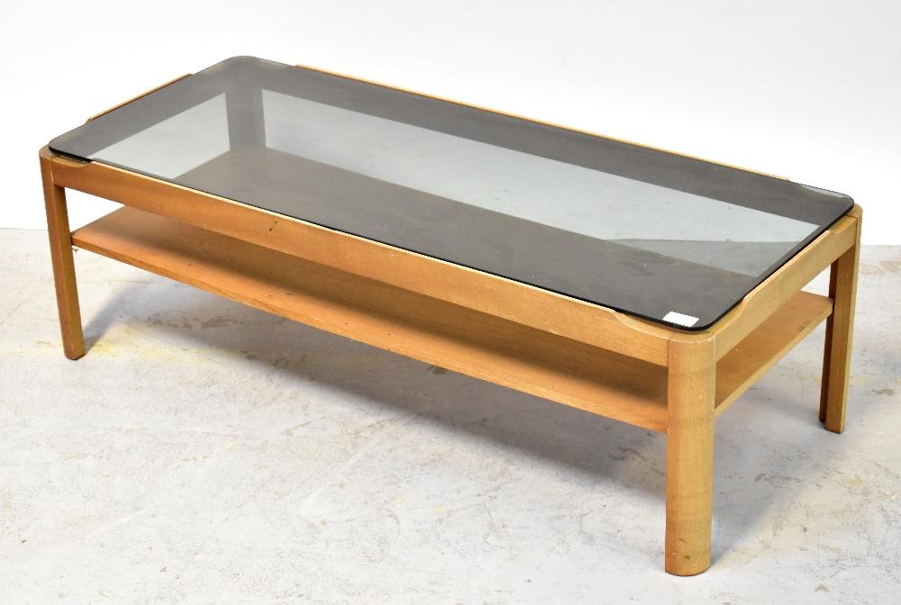 Lot 59 of 1054: A 20th century teak coffee table, with smoky glass top and solid undershelf, on quarter cut legs, 36 x 112 x 48cm.