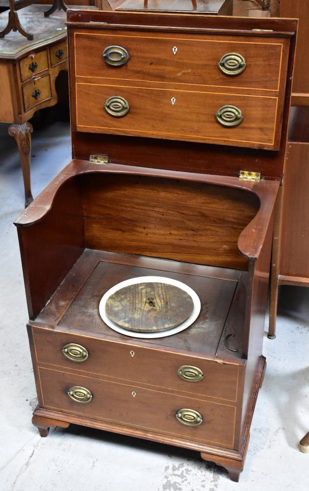 Lot 64 of 1054: A 19th century mahogany line inlaid commode in the form of a four-drawer bachelor's chest, the hinged upper section opening to reveal a ceramic liner with lid, raised on bracket feet, dimensions when closed 77 x 64 x 45cm (af).