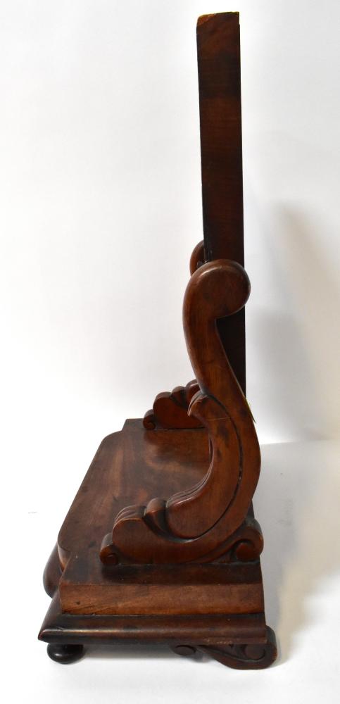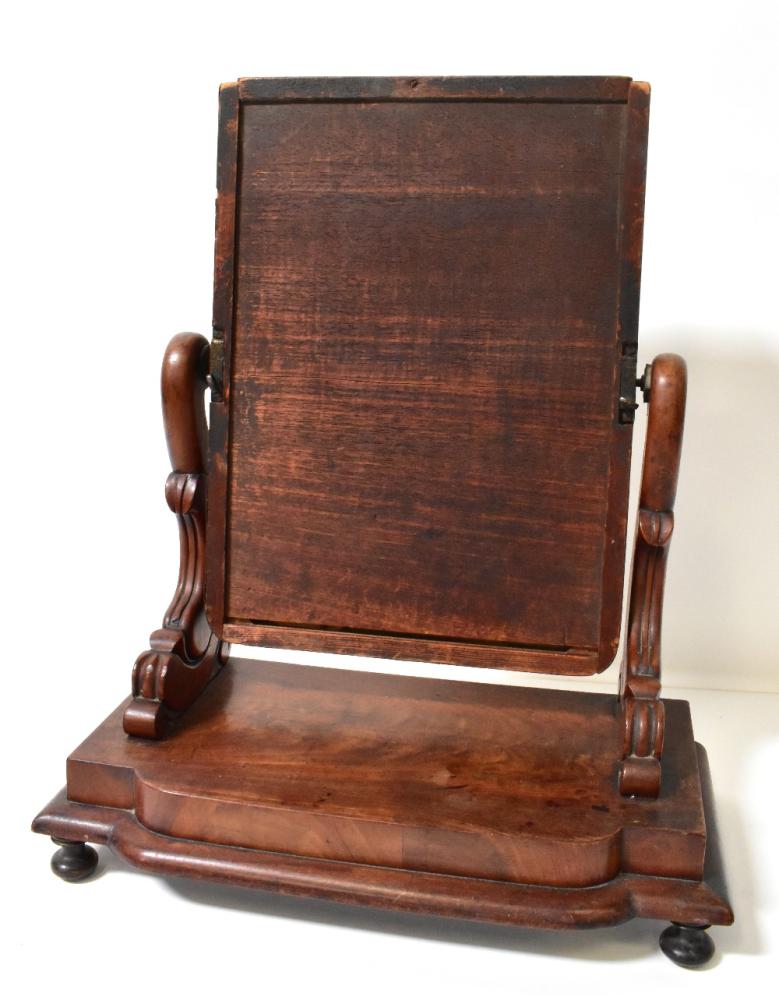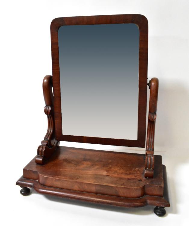 Lot 86 of 1054: A 19th century Victorian mahogany swivel toilet mirror held with scroll bracket sides, on stepped base, raised on ball feet.