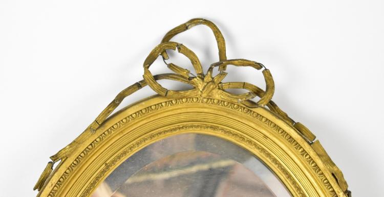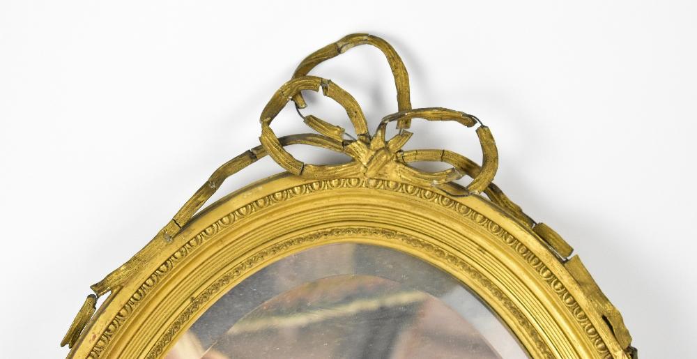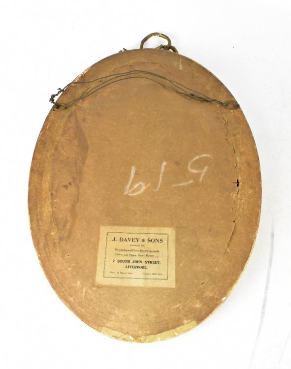 Lot 87 of 1054: An early 20th century gilt-framed oval mirror, with bevelled mirror plate within a Neo-Classical style frame, with egg and dart moulding, surmounted by a ribbon tied in a bow, label to reverse 'J. Davey & Sons, 7 South John Street Liverpool', 54 x 38cm.