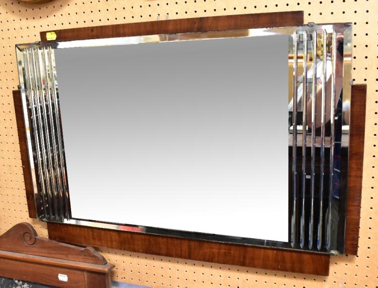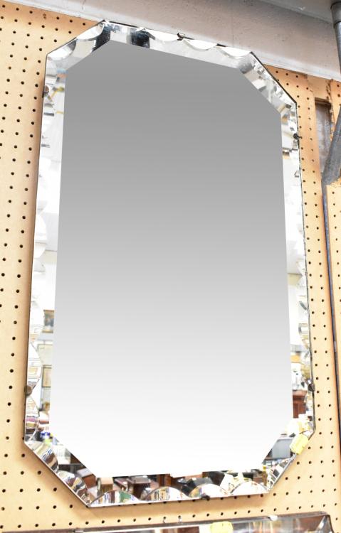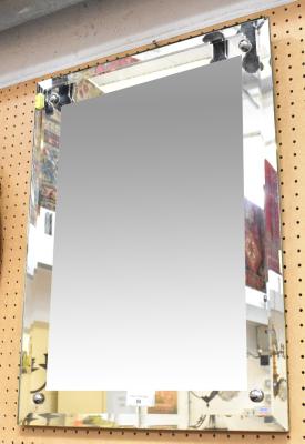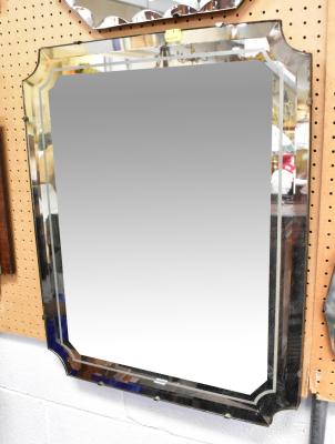 Lot 88 of 1054: Four vintage wall mirrors comprising an Art Deco style rectangular bevel edge wall mirror, with five vertical line cuts at either side, mounted on wooden backing, the backing 48 x 74cm, a wall-mounted rectangular bevel edge mirror with four chrome screw caps, 41 x 56cm, a rectangular example with cut corners and scalloped bevel edge, 38 x 64cm and a wall mirror with cut-out corners, bevel edge and reverse painted green trim, 48 x 60cm (4).