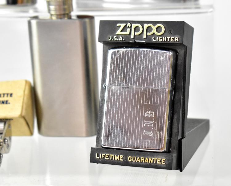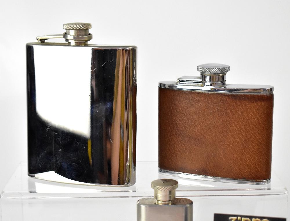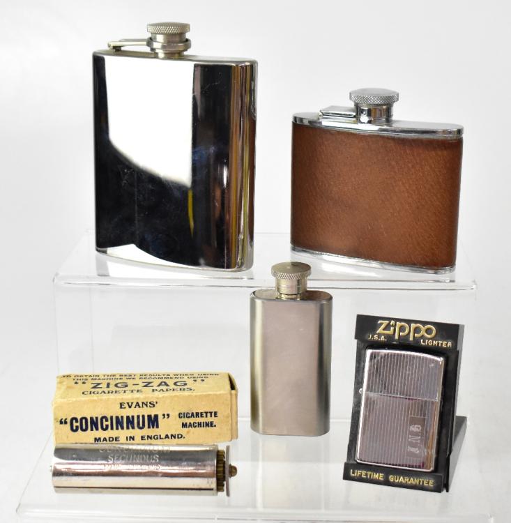 Lot 229 of 1054: Various collectibles to include three hip flasks, one with leather covered body, a Zigzag cigarette roller and a Zippo-style lighter (5).