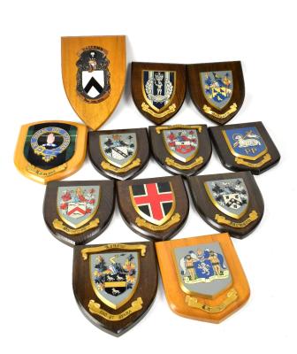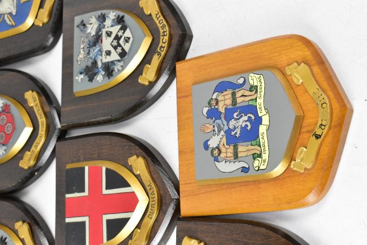 Lot 230 of 1054: Twelve wooden wall mounted shields, various place names, mottos and crests, to include Askew, Durham, Lamont, Gainford, Preston, etc, average height approx 17cm, width 15cm (12).