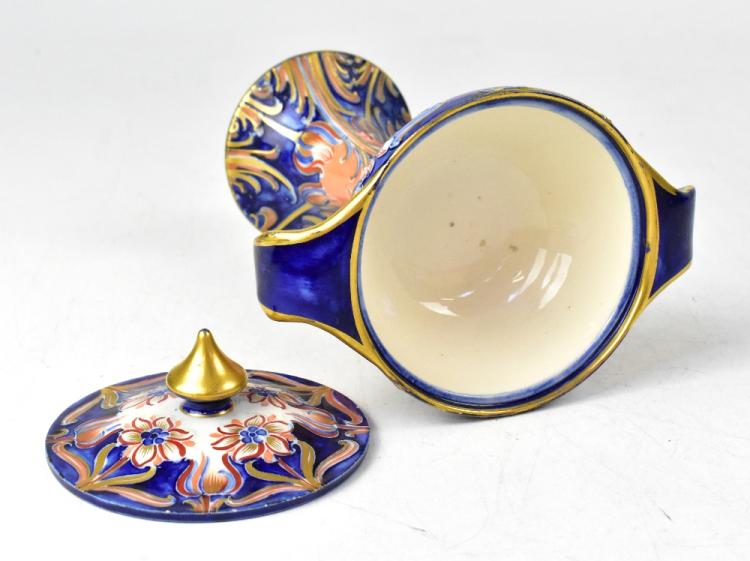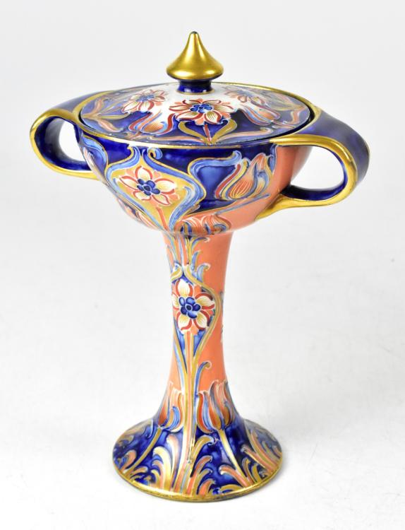 Lot 287 of 1054: MACINTYRE; a c1903-1905 Florian Ware 'Alhambra' pattern twin-handled chalice and cover, in the Imari palette, with brown printed marks to base, No.M2412, height 22cm.