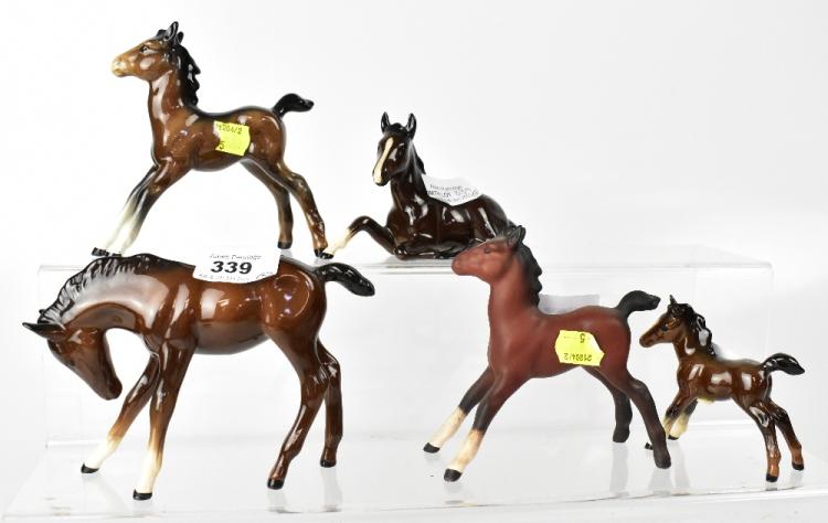 Lot 339 of 1054: BESWICK; five various brown gloss and matte foals, to include a small brown gloss foal looking left, a large foal looking right, stretched, in matte brown, a large foal looking right, stretched, in brown gloss, a large foal with head down, in brown gloss and a shire foal lying (5).