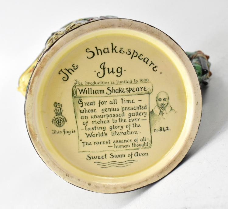 Lot 341 of 1054: ROYAL DOULTON; 'The Shakespeare Jug', a series ware limited edition jug no.842/1000, with relief moulded Shakespearian figures in panel around the jug, with mask spout within laurel leaves, the top annotated 'Great Heir of Fame Dear Son of Memory', figures titled below on band, handle moulded with theatrical masks and daggers on a leafy ground, base named and numbers, 'William Shakespeare great for all time - whose genius presented an unsurpassed gallery of riches to the everlasting glory of the
