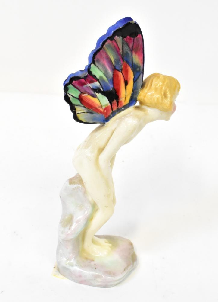 Lot 342 of 1054: ROYAL DOULTON; a rare early figure HN1324 'The Fairy', depicting a young girl with brightly-coloured butterfly wings, resting on a stone plinth, with Doulton stamp to base and hand written details, height 16cm, issued 1929-1938, Style 1, multicoloured wings.