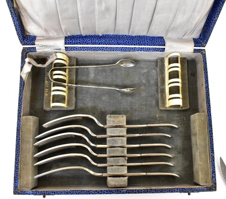 Lot 890 of 1054: Six hallmarked silver teaspoons with Art Deco style finials, one other teaspoon with scrolled finial and a Fiddle pattern condiment spoon initialed 'G', various dates and makers, combined approx 2.8ozt, together with a quantity of plated silver wares to include a partial set of forks and a cocktail whisk.