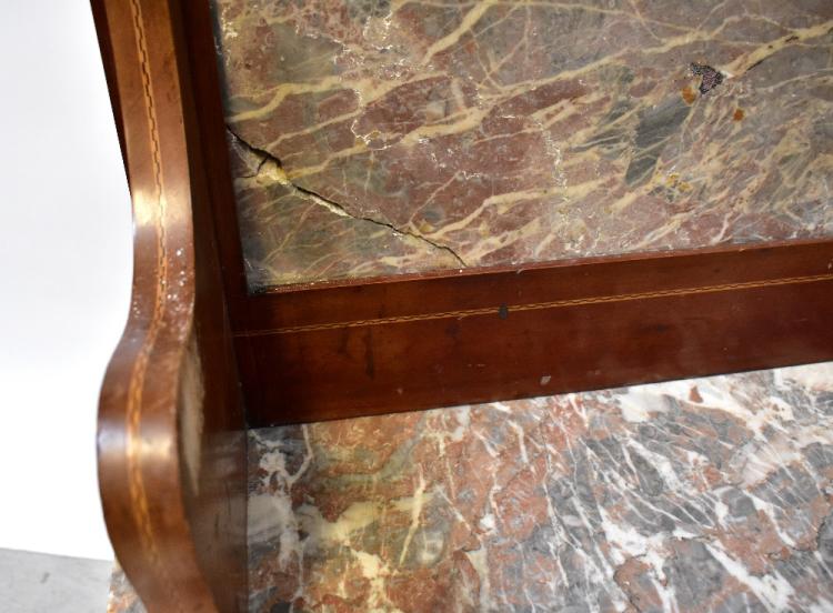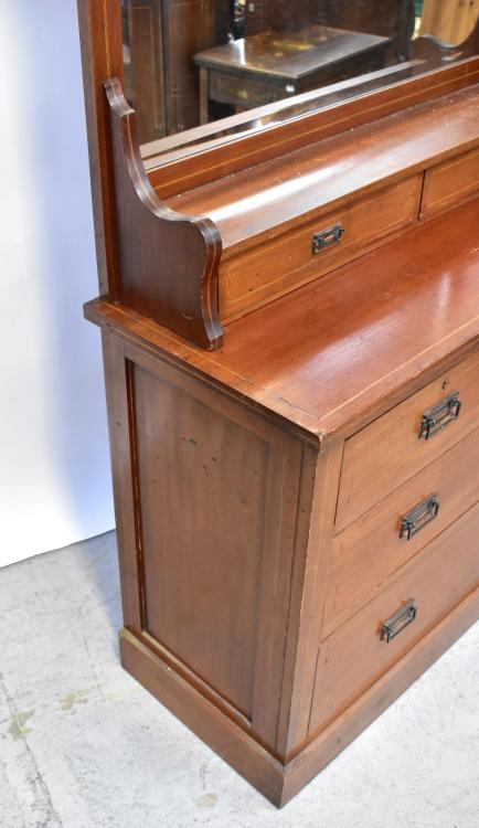 Lot 13 of 1434: An Edwardian mirror back rouge marble top wash stand with string inlay, above two drawers and two cupboard doors, to plinth base, 179 x 113 x 46cm, and an Edwardian mahogany mirror back dressing table with string inlay, large curved top mirror above three long drawers, to plinth base (2).
