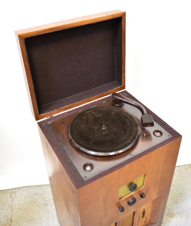 Lot 20 of 1434: An early 20th century walnut cased Art Deco style radiogram, with hinged lid opening to reveal a Collaro turntable, 91 x 49 x 40cm.