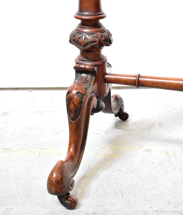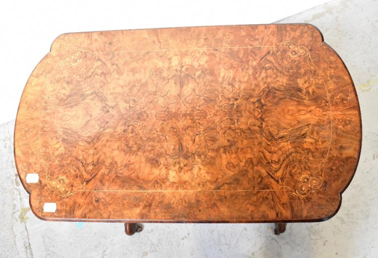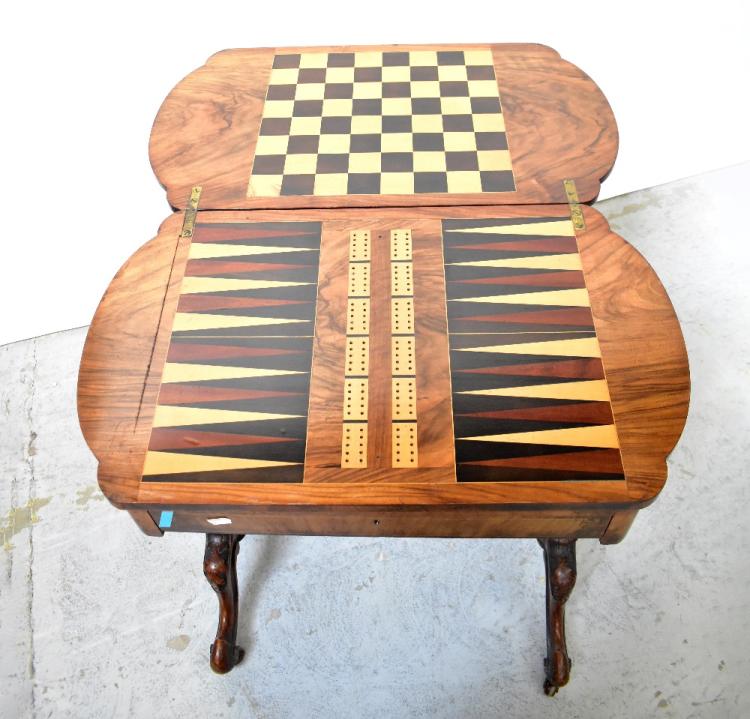 Lot 32 of 1434: A Victorian walnut games table, the revolving shaped and inlaid top enclosing an inlaid chequerboard to one side and backgammon and cribbage boards to the other, on turned twin supports united by a stretcher, with cabriole legs, 77 x 69 x 40cm.