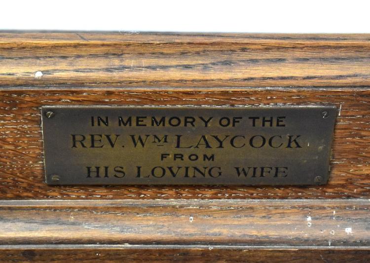 Lot 32A of 1434: A Victorian carved oak lecturn with sloped top above a carved base with two star motifs with fleur de lys to the centre of each and with brass plaque, inscribed 'In memory of the Rev. Wm Laycock from his loving wife', height 118cm.
