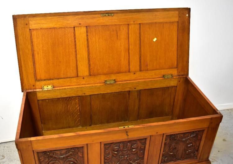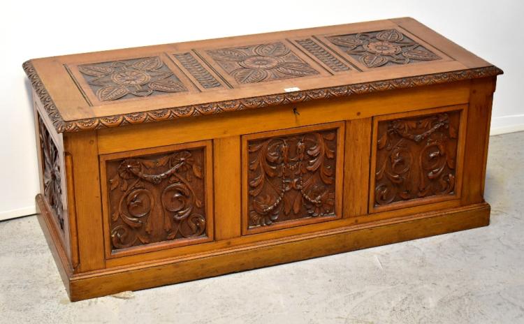 Lot 46 of 1434: A reproduction oak bedding box with carved front panels of floral design, with swags and carved floral panels to the top, sides and lid edge, 48 x 125 x 53cm.