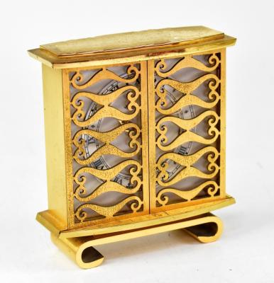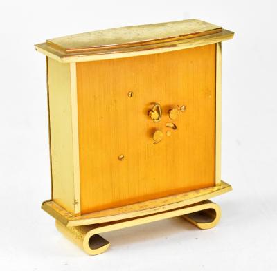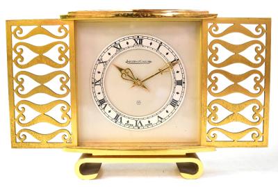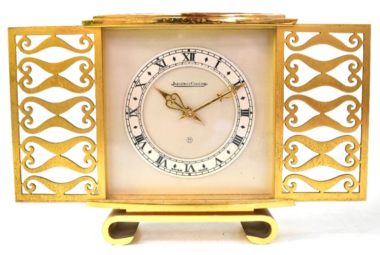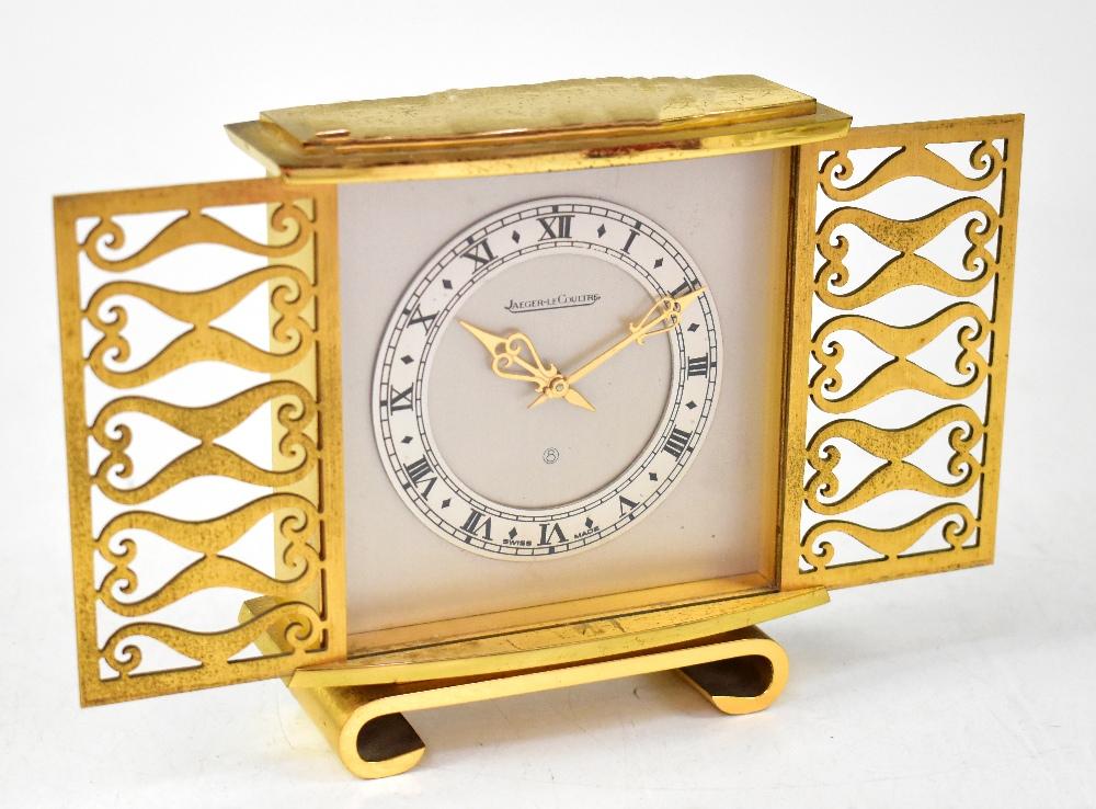 Lot 133 of 1434: JAEGER-LECOULTRE; a gilt brass mantel clock, the pierced sliding doors enclosing a silvered face and chapter ring set with Roman numerals, signed to the centre, with wind-up mechanism, the rectangular clock on a scroll base, height 12.5cm.