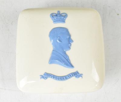 Lot 220 of 1434: A Royal Doulton Bunnykins twin-handled nursery cup, saucer, side plate and bowl, various years, together with a Wedgwood George VI and Queen Elizabeth 1937 jasperware square lidded box, a Northwood-style grapes and autumn leaf carnival glass bowl with wavy edge, two decorative glass paperweights and a pair of vintage brass push-up candlesticks (10).