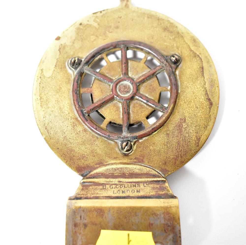 Lot 221 of 1434: A vintage brass and enamelled RAC (Royal Automobile Club Association), membership grille badge made by Collins of London, central enamelled union flag within spoke wheel, with embossed words either side of crown, 15 x 9cm.