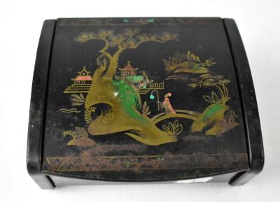 Lot 222 of 1434: A collectors' lot comprising a hallmarked silver Morden propelling pencil and one other silver propelling pencil, three crowns, a Siam white metal cigarette case with niello work and chinoiserie design, and a black Oriental metal box.
