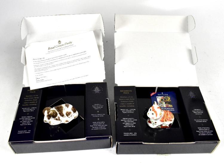 Lot 281 of 1434: ROYAL CROWN DERBY; two Imari paperweights comprising 'Scruff' a spaniel, and 'Spice' a kitten, each with gold button, both 6cm, in original member's pack boxes (2)