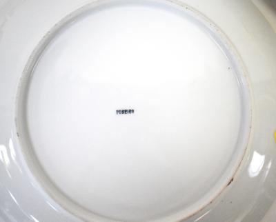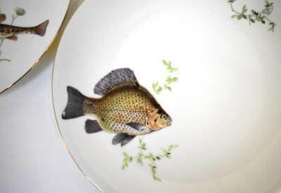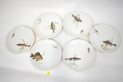 Lot 285 of 1434: Six Continental porcelain plates, each decorated with a coloured printed design of freshwater fish swimming with various insects, dragonflies, etc, on a white ground, marked 'Foreign' to the reverse, diameter of each 25cm (6)