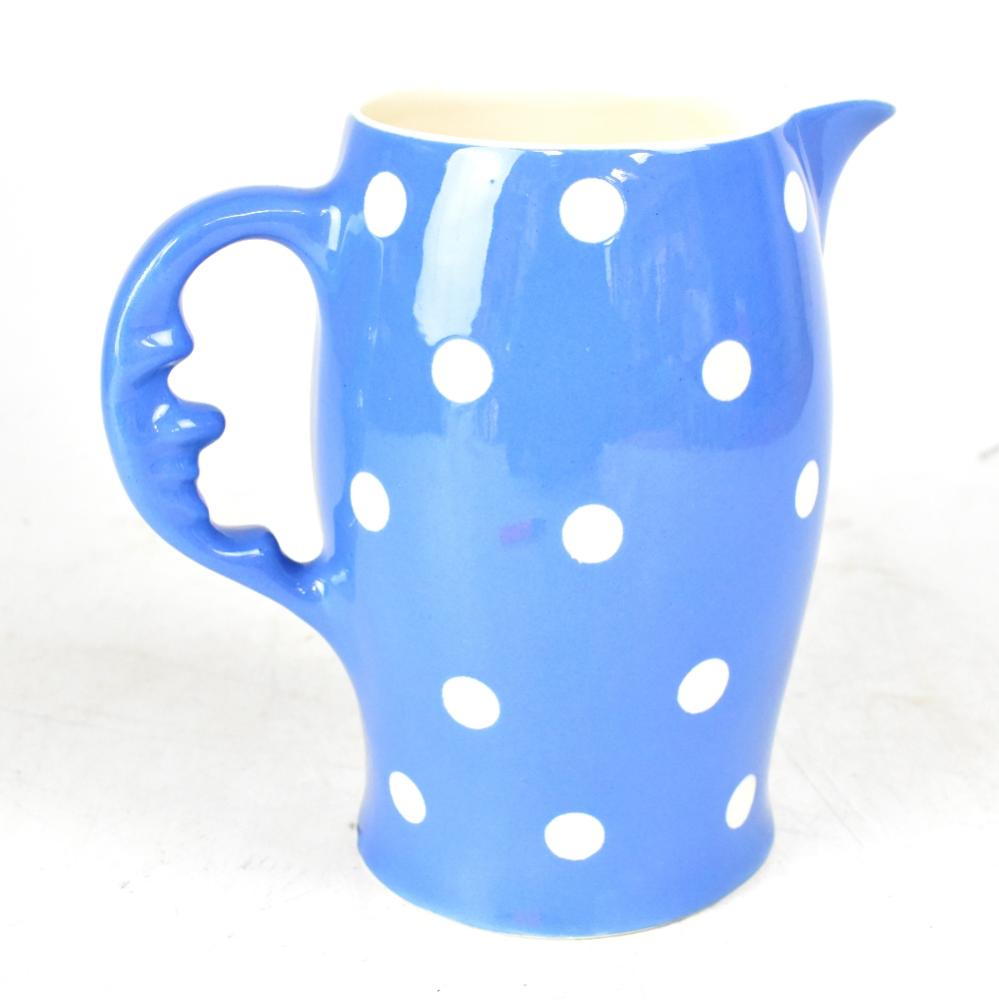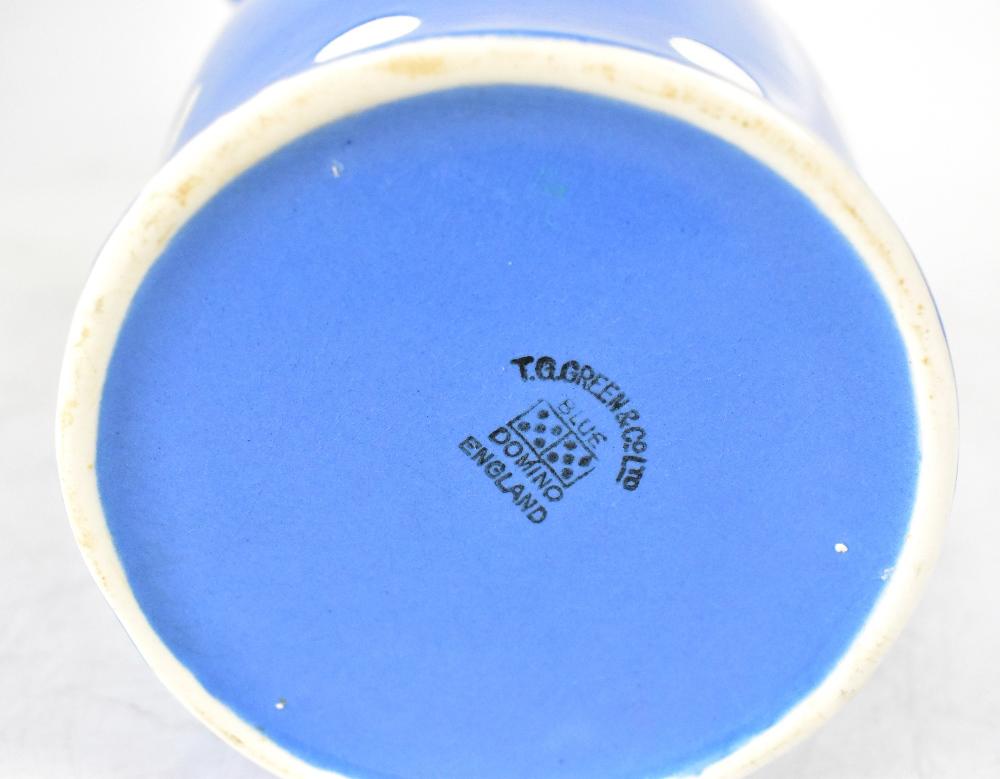 Lot 288 of 1434: T G GREEN & CO; a blue Domino pattern jug with unusual 'Man in the Moon' handle, printed marks to base, height 19cm, and a small group of decorative ceramics.