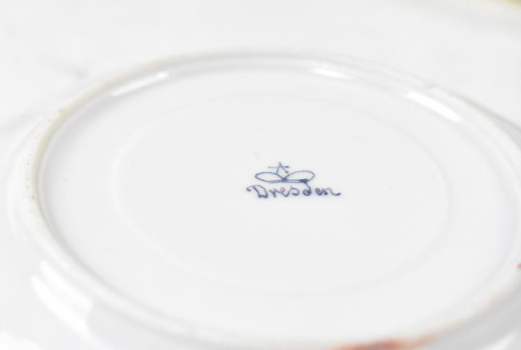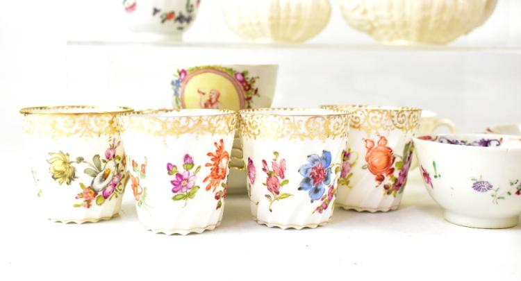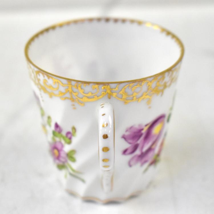 Lot 294 of 1434: Various 19th century Continental porcelain items to include four Dresden hand painted coffee cans and six matching saucers decorated with the 'Dresden Spray' pattern, with gilt edging, a Meissen-style tea bowl with crossed swords mark to base and oval panel to the front depicting a lady holding up a stone, within floral garlands (11).