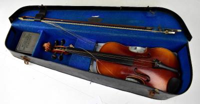 Lot 563 of 1434: Three violins comprising a 3/4 size two-piece back violin with bow in felt lined case by Rushworth & Dreaper Musical Instrument Makers Islington Liverpool, one other violin with two-piece back with bow in a similar case by the same maker, and a further full-size violin with two-piece back, in need of repair, within a wooden case (3).