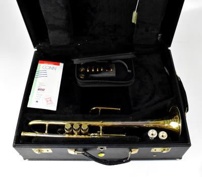 Lot 566 of 1434: CONN; a 'Vintage One' brass trumpet, serial no.942416, USA made, in a Getzen hard carry case, with two mouthpieces, a zip bag of additional parts and various cleaning equipment, etc.